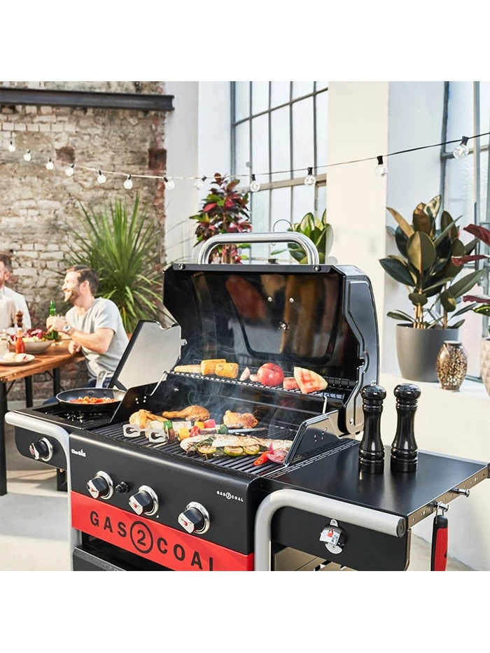 Un brûleur latéral en acier inox vous permet de préparer des sauces ou des légumes. Une étagère latérale permet de ranger vos ustensiles ou autres accessoires de cuisson. Le thermomètre est intégré au couvercle et deux grandes roues permettent de déplacer aisément votre barbecue.