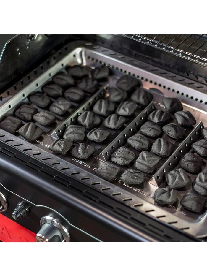 – Plateau à charbon de bois breveté : La nouvelle ligne du plateau permet au charbon de bois de brûler de haut en bas et non de bas en haut. Des flux d’air guidés réduisent les retours de flamme et permettent une combustion plus efficace tout en produisant de la chaleur.