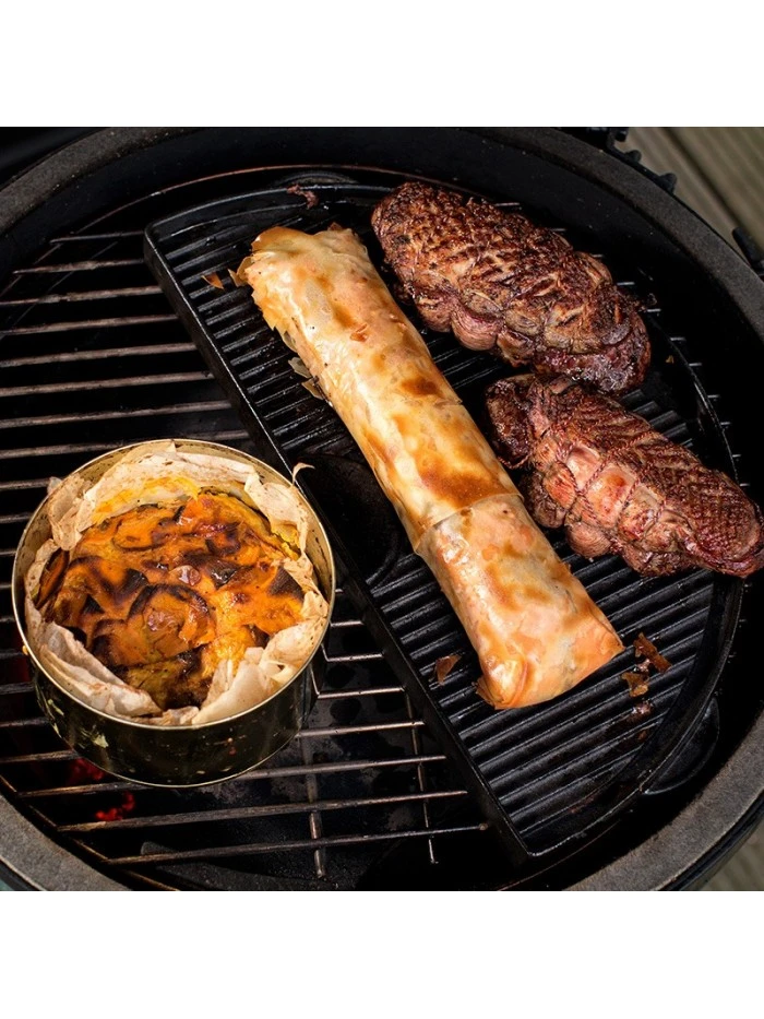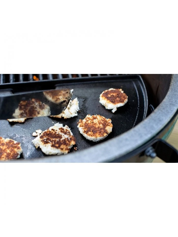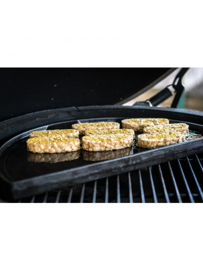 La Demi Plancha Plaque de Cuisson en Fonte Big Green Egg est un accessoire pour barbecue Large à poser sur la grille du barbecue au charbon Big Green Egg ou à placer sur l’EGGspander.