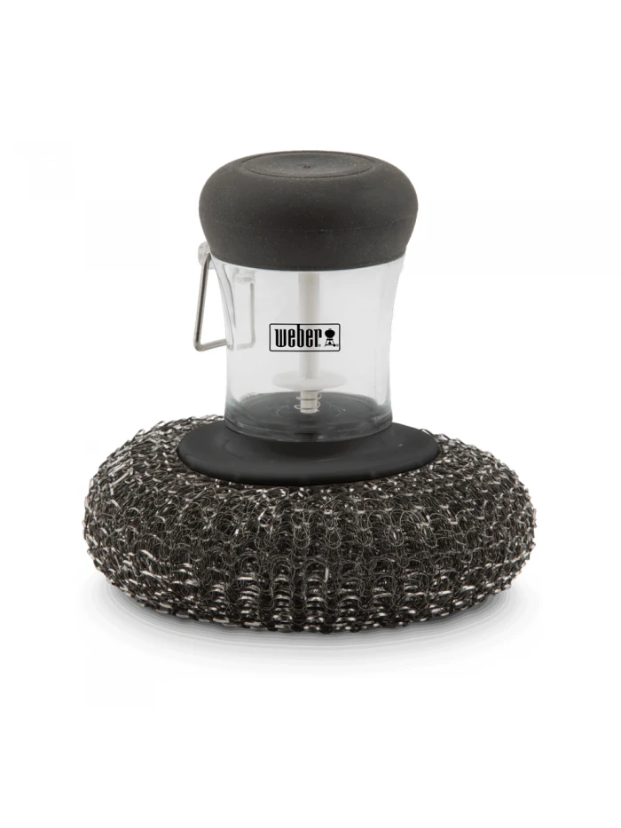 L’éponge métallique pour plancha enlève les aliments collés tout en protégeant la surface lisse de votre plancha. Placez l’éponge sur la plancha et appuyez doucement sur le bouton du manche pour libérer le savon.